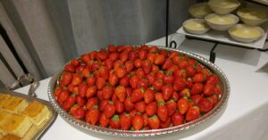 会員同士久しぶりにお会いする方々、初めてお会いする方々とも、楽しくお話しが弾み、親睦を深めることができました。デザートのクナーファやマハラビーヤ(ミルクプリン)、そして会員の小林様からご寄付頂いた沢山の新鮮なイチゴも、オマーンコーヒーと共に味わい深かったです。